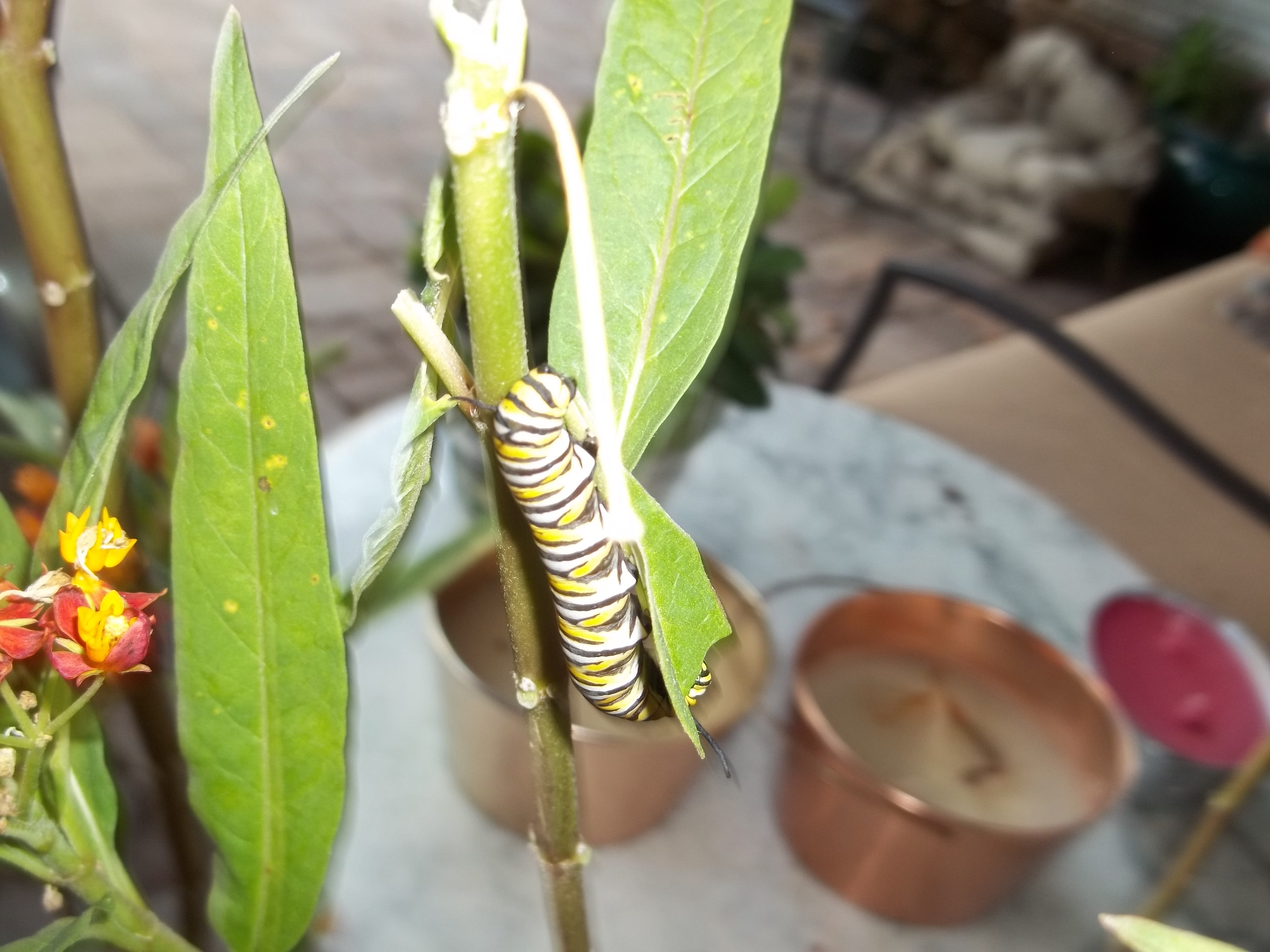 Recently our favorite garden center had a greenhouse sale. It is hard for me to pass up plants we love to have in our garden on sale for $2, so I came home with a large healthy milkweed. I parked it on the back porch until I could pick a good spot in the yard for it. I shouldn’t be surprised since I know that milkweed is the only plant on which Monarch butterflies lay their eggs, but was pleasantly amazed the next day when I discovered my lagniappe – 6 tiny caterpillars munching away at the milkweed leaves. I had to laugh as I remembered a conversation I overheard while I was looking at the nursery plants.