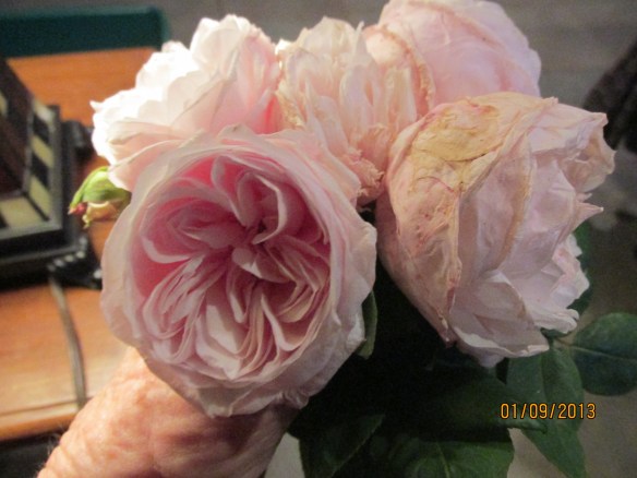 While many of our friends and family are wearing their warmest outdoor gear and shoveling snow, we have had a succession of cold, wet days that seemed to be just what the roses needed to cheer us with round mounds of fragile petals. I brought these inside more for their exquisite fragrance than for their beauty. I knew they wouldn’t last very long in the dry warm air of my kitchen, and they didn’t. At least, the blooms didn’t, shattering petals almost as soon as I put them into water. But their scent remains. I am grateful for the reminder of beauty experienced in ways other than my eyes and the lingering of joy – the way a phrase of song runs through my mind for days after it has been sung, the warmth of touch remaining after a hug, the smile that stays on my face even though the telephone conversation has ended.