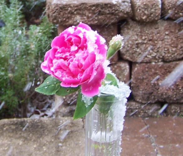 RoseinSnow2009The past week has been unusually cold and wet here.  One day was said to have been the coldest ever for this part of Texas.  Of course, we have not had the snow and ice so many north of us have had, but I am remembering one day in the first week of December in 2009. I took this photograph while it was snowing.  The rose is one of my favorite antique roses.  It is called Maggie, and is the only rose I know that has a sweeter fragrance after it is cut to bring inside.  I remember, too, the sweet carol that it illustrates.  Old rose, ancient song, story forever new.