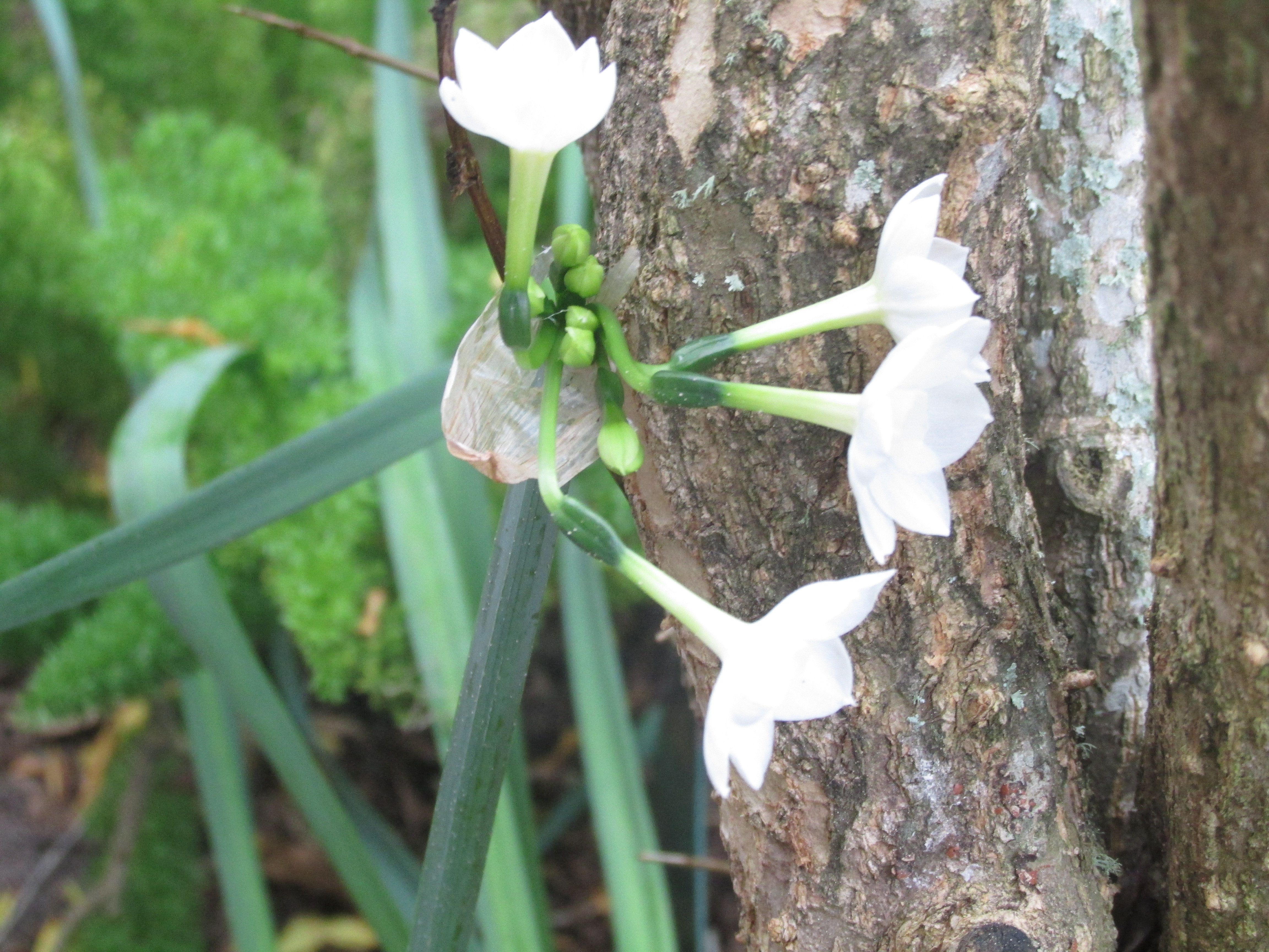 This small bunch of wonderfully fragrant Paperwhites blooms all by itself in an almost hidden spot by a pomegranate tree on the side of our house. Members of the narcissus family have a sap that contain a chemical that causes other flowers to wilt, so they should not be mixed in a vase with other flowers. This bit of garden trivia helps me to remember value in simplicity and solitude.