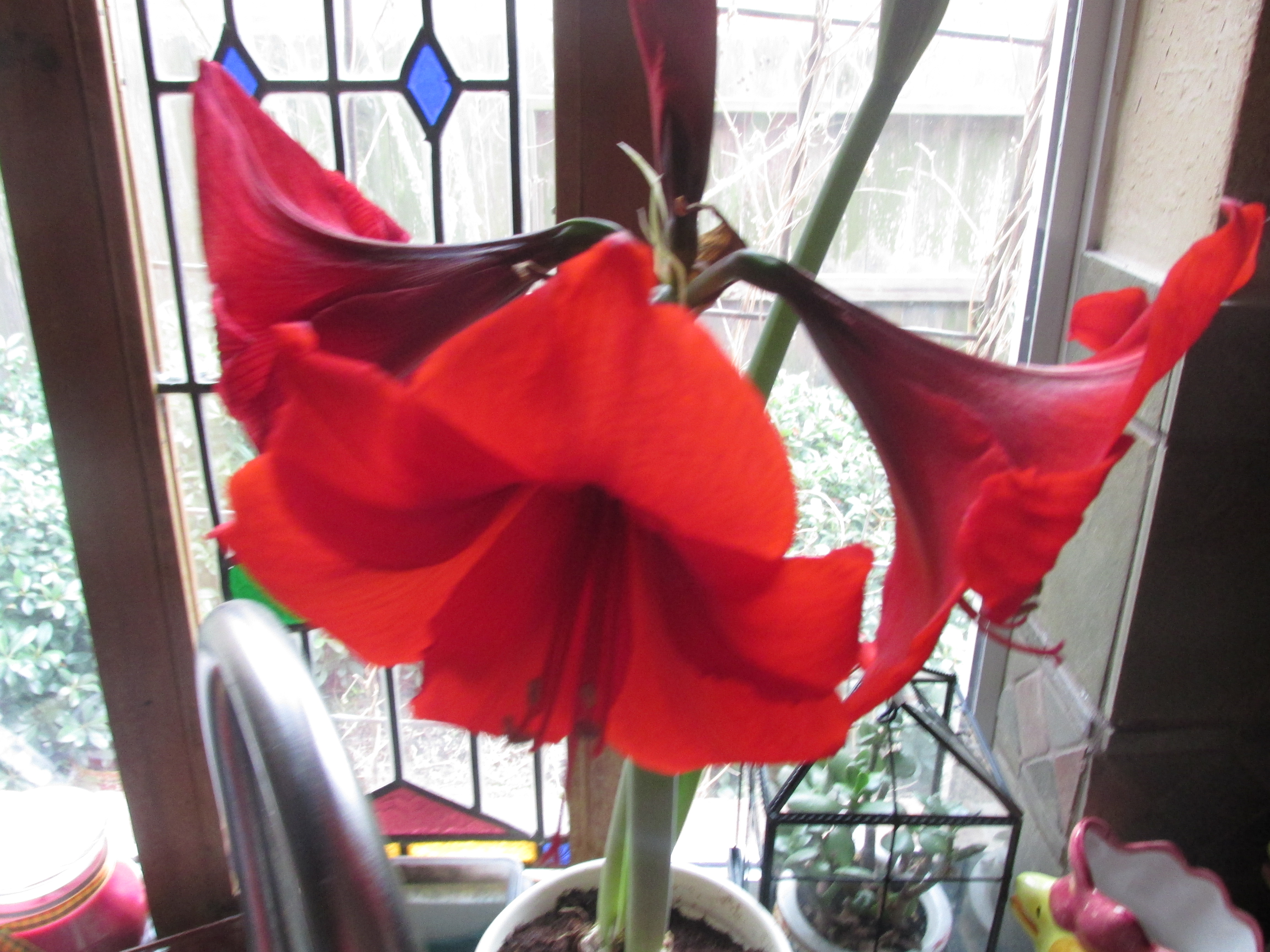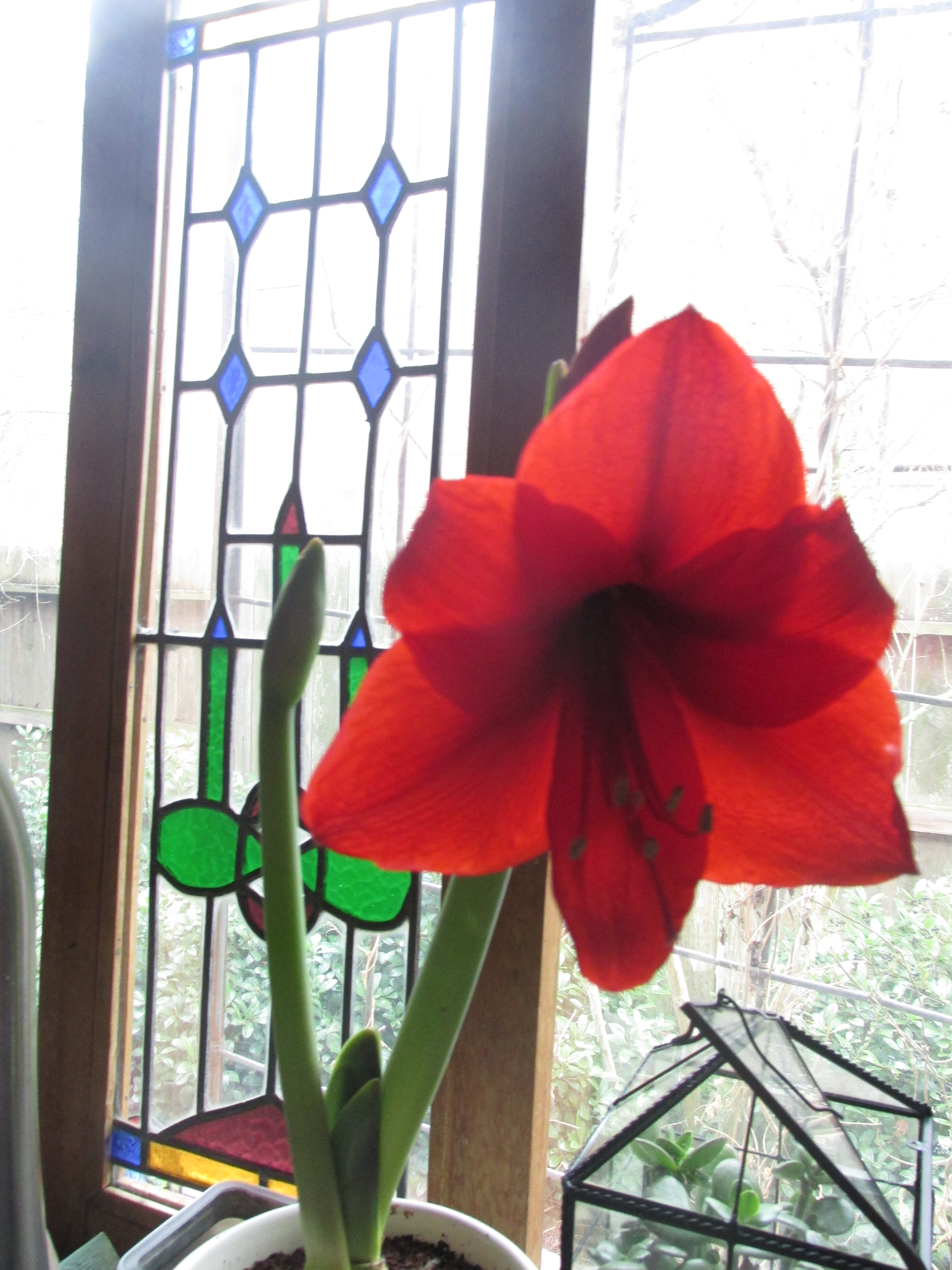 Recently when family gathered to help us celebrate our 50 years of being married, we were given a small white pot which contained a plastic bag filled with potting soil and a dried, brown ball with papery layers peeling back about the size of a small onion. It was an Amaryllis bulb. As long as I let the pot, the soil, and the bulb wait on my counter, nothing much happened. There was one place where a spot of green wanted to push through its crackly wrapping, but seemed to have grown weary and quit trying. But as soon as opened the soil packet and poured it into the pot, pushed the bulb down, set it in a window, and added water, I could almost hear the dry dirt begin to breathe a lullaby to hungry roots as they began to channel new life into stalk and leaf. Two sturdy stems soon grew heavy with swelling buds. Above, the first scarlet flower opens wide, stamens heavy with pollen.