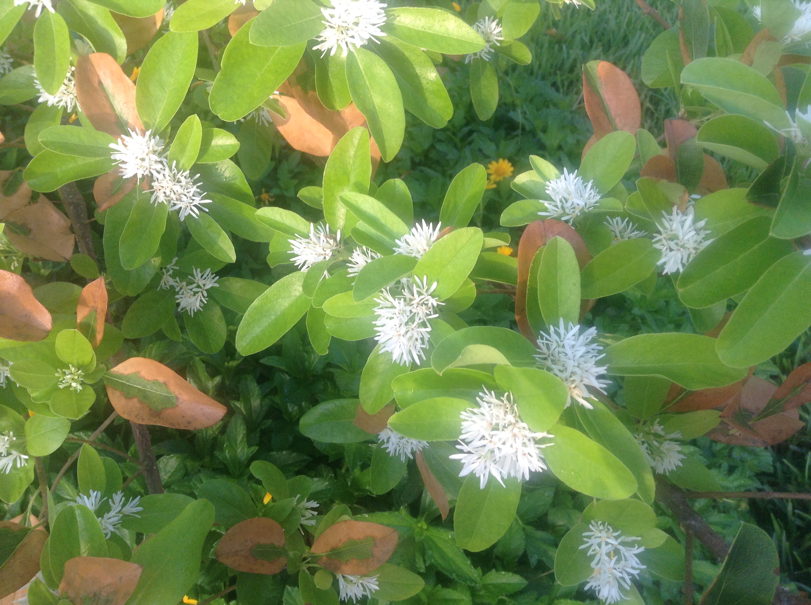 One day we noticed new white blooms! The tree evidently thought it had survived fall and winter and that Spring had returned!