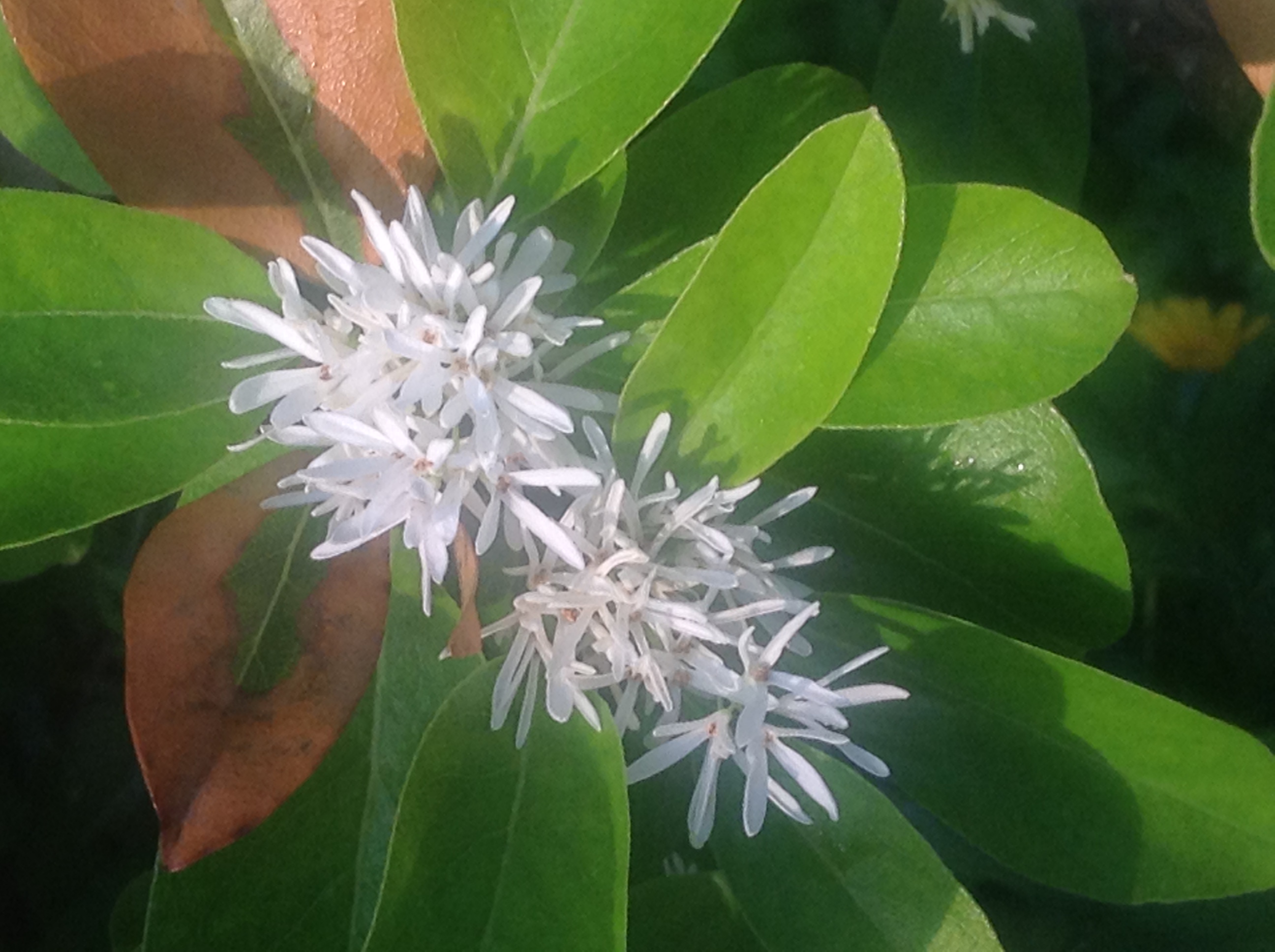 Last Easter we planted a Chinese Fringe tree in our front yard. It already had white blooms and as more opened, the tree was covered with clusters of small white blooms. It is a deciduous tree and the blooms appear after the leaves each Spring. As temperatures soared in July, we noticed a few brown leaves and then more. We made sure the little tree was watered deeply every day; for awhile it seemed that we would lose it. But over a period of weeks, new green leaves outnumbered the brown ones. Gradually, the tree announced its survival