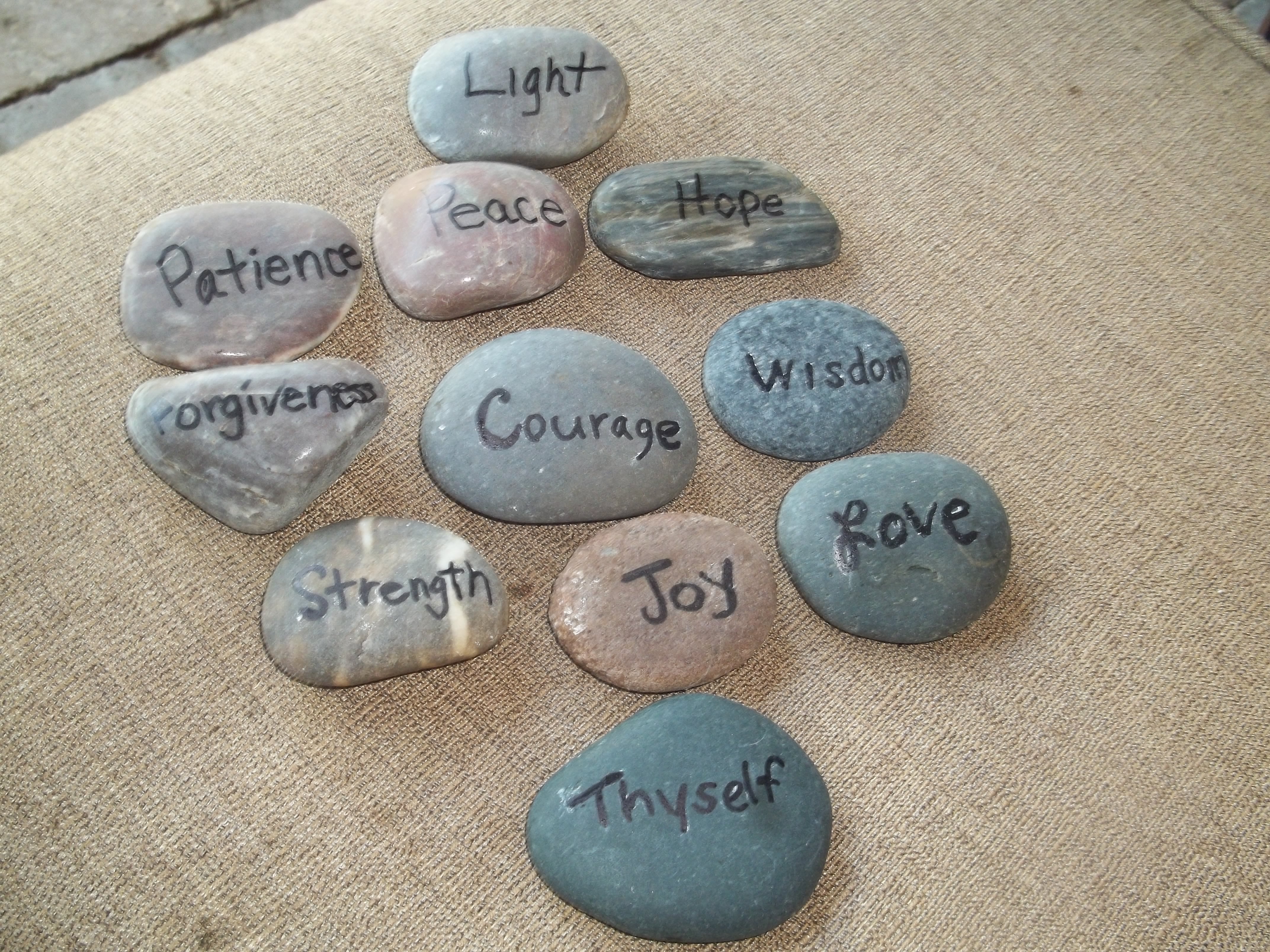 I keep a small basket of smooth stones, each marked with a word,  on the back porch which I use like prayer beads. Somehow, as I lift a stone and place it beside me with a prayer for each thing the word I have written there represents, I am able to focus more sharply and receive these gifts.  I keep the same list by the coffee pot in the kitchen and can cover it with the palm of my hand in my petition.  Laying the stones down is a random process, so I am drawn to the pattern on this particular day when I look at all of them together.   I begin with seeking Light and the progression leads me to the most important request, “Thyself.”  I realize that if I could have only one request it must be that, for it is in the presence of God I find the all the rest.