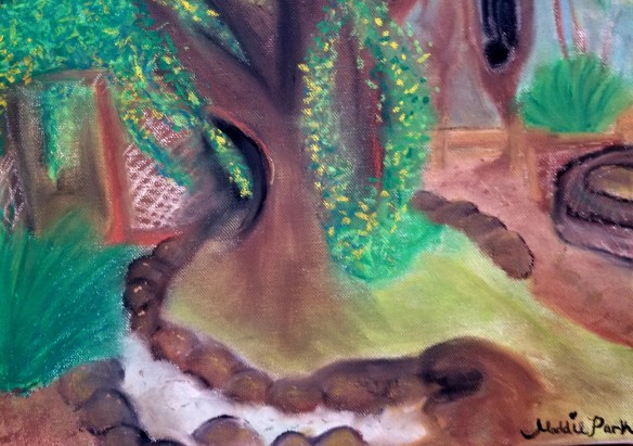 When my son and granddaughters were with us in the first days of this new year, my thiirteen year old granddaughter wanted to paint in the prayer garden at our church. While she sketched and painted with oil pastels, I savored being back in this space after a long absence. I have written before about this small garden and ancient oak tree. I have photographed the labyrinth and written about its prayer walk. The word I chose for a focus word for 2020 is savor but I didn’t even think intentionally about that. My joy in being back there, watching Maddie take it all in and put her impressions into her work was complete.